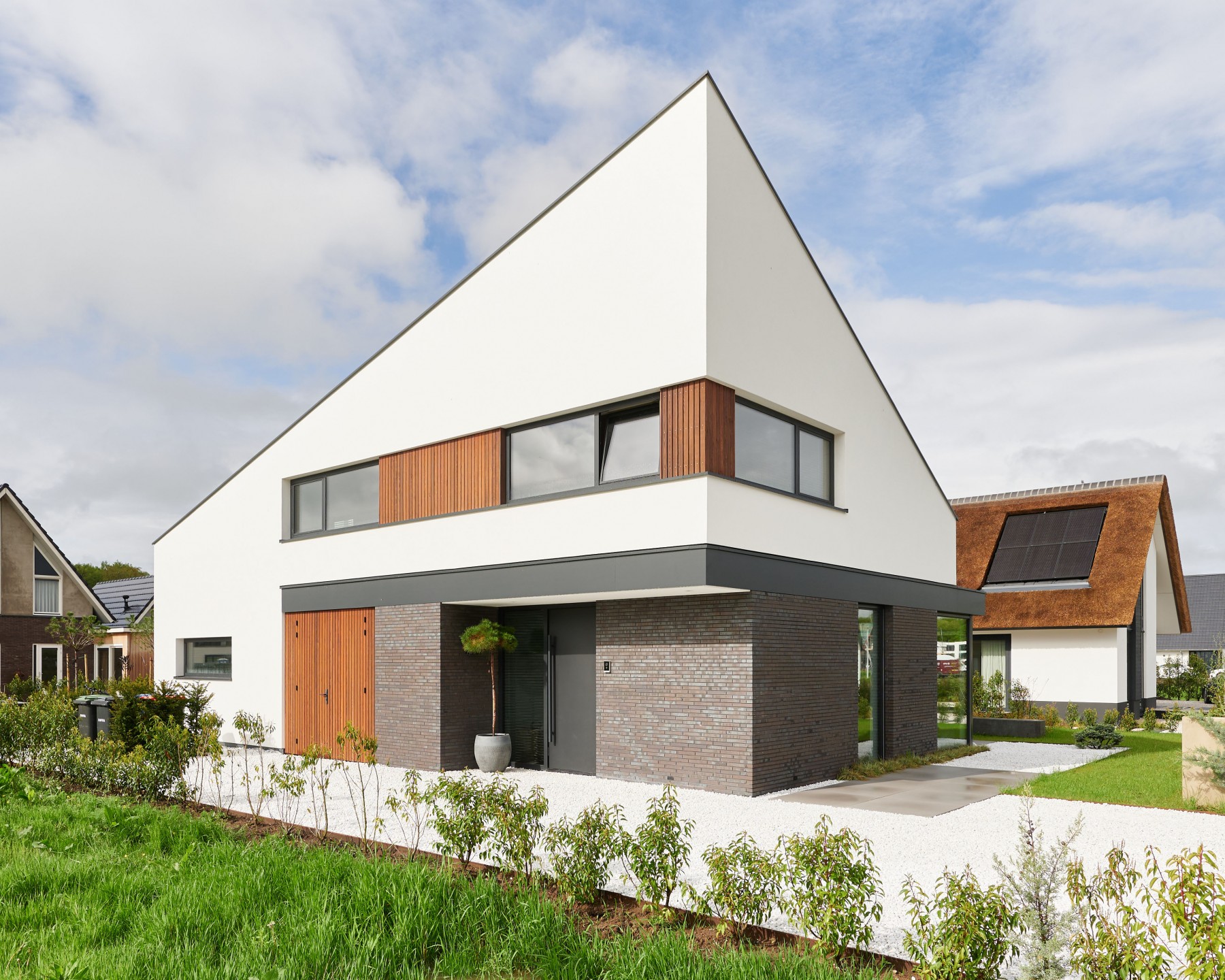 De villa is afgewerkt met moderne materialen zoals wit stucwerk, langformaat bakstenen en verticale houten gevelbekleding. Het dak is afgewerkt met zwarte metalen felsbekleding. Om de hoofdvorm te benadrukken, zijn de dakgoten subtiel weggewerkt door middel van verholen goten.