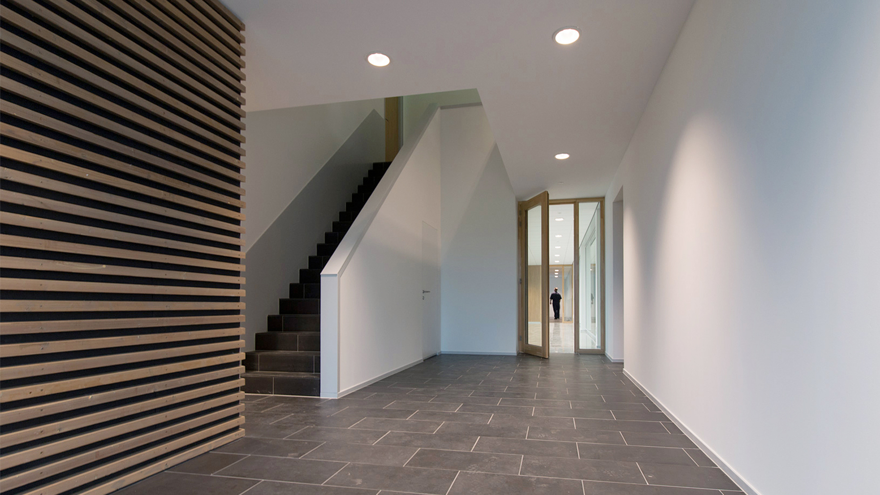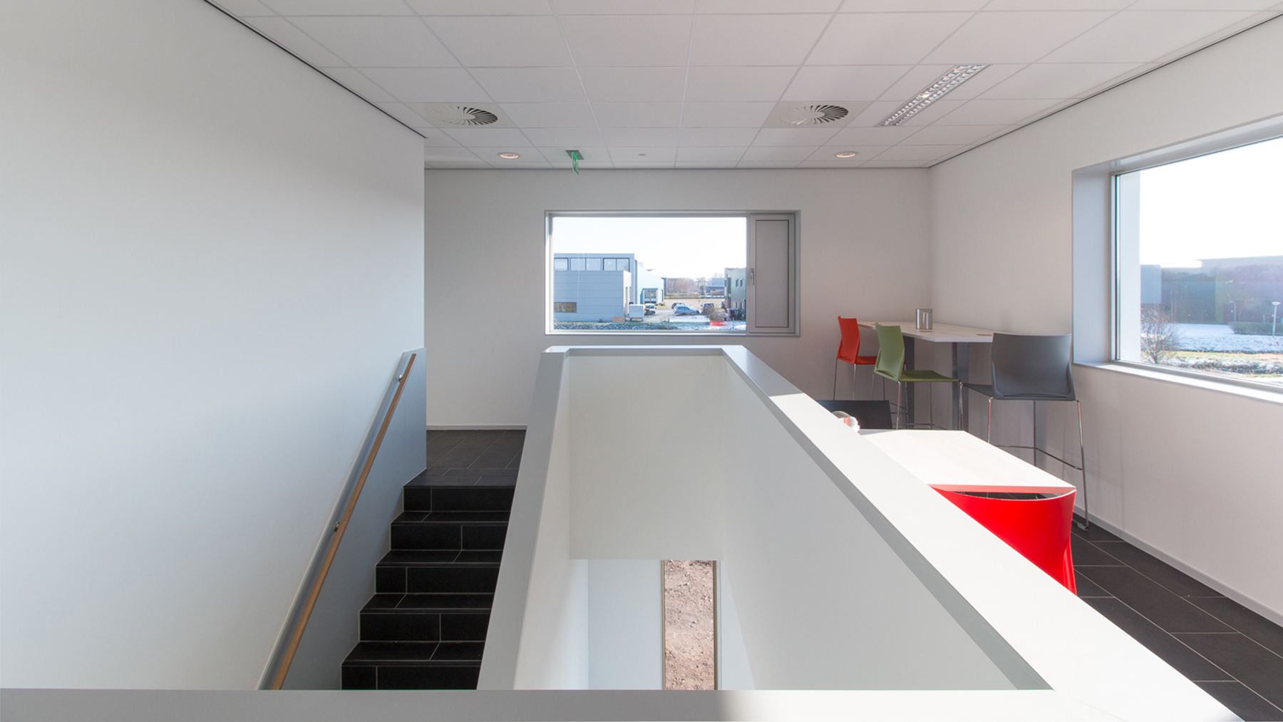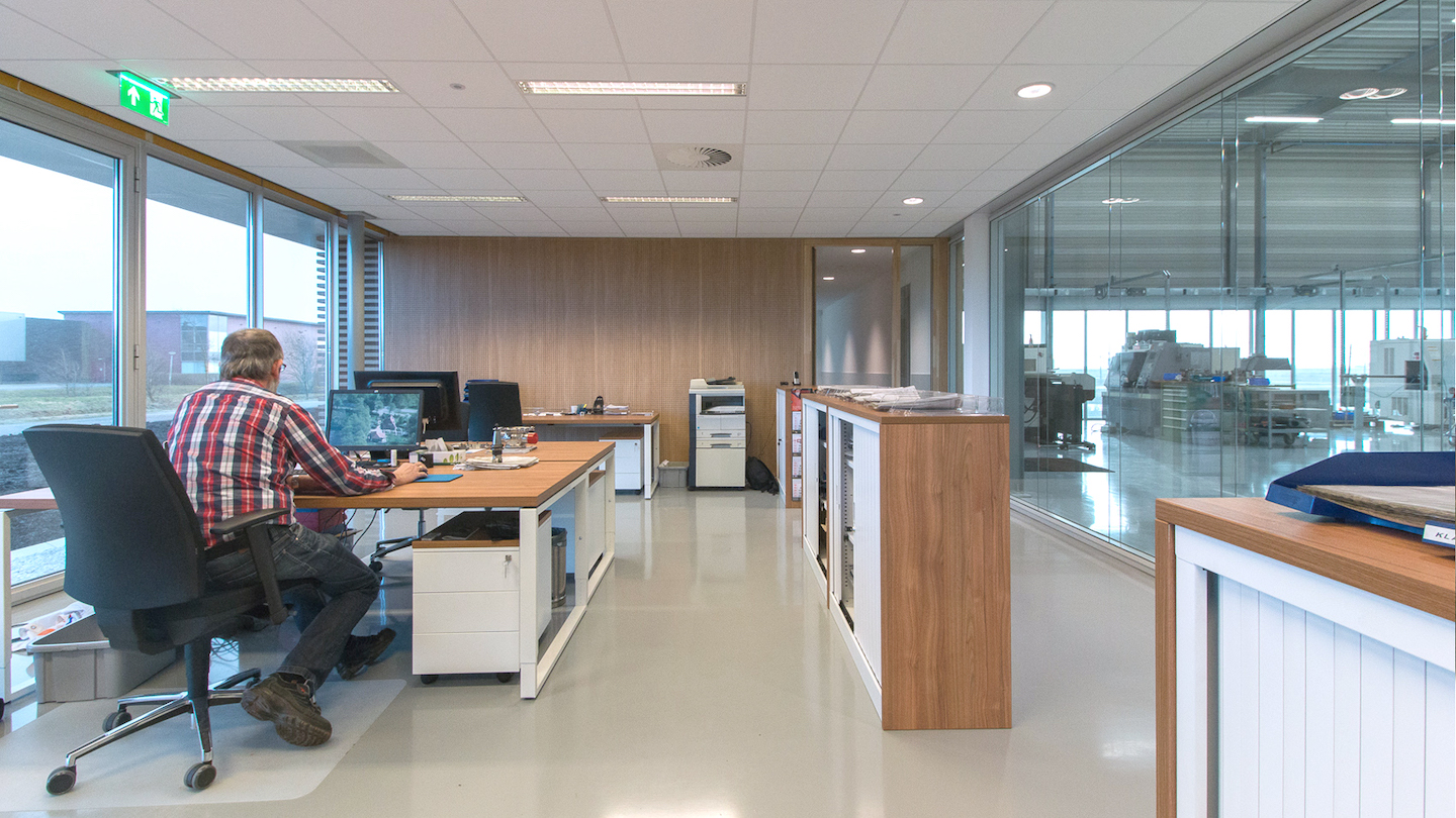 Twee houten volumes markeren de entree aan de noordzijde en de kantine aan de zuidzijde. Hierin zijn de natte cellen en het verticale transport opgenomen. De kantoortuin tussen de houten volumes benadrukt de vlakke organisatie van het bedrijf: kantoorpersoneel en fabrieksmedewerkers delen dezelfde vloer. Op de bovenverdieping bevinden zich enkele privé-kantoorruimtes, een vergaderruimte en de kantine.